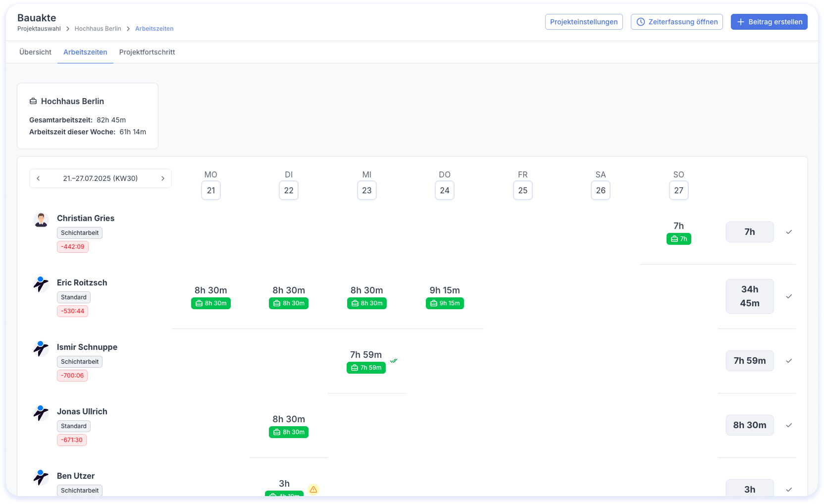 Arbeits- und Pausenzeiten werden direkt in der Bauakte auf das jeweilige Projekt gebucht. Im Büro sehen Sie live, wer woran arbeitet und können die Daten direkt für die Lohnabrechnung nutzen.
