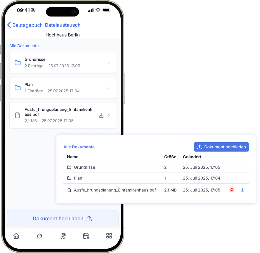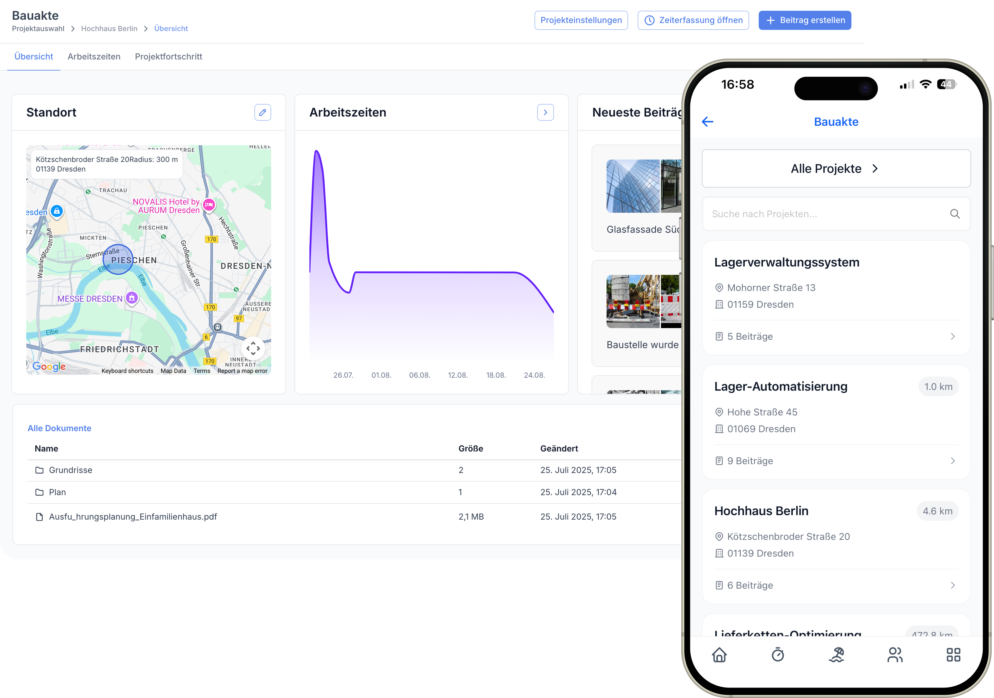 Unsere digitale Bauakte bündelt alle relevanten Informationen an einem Ort. Ihr Team auf der Baustelle erfasst den Fortschritt lückenlos per App, greift immer auf aktuelle Dokumente zu und bucht Arbeitszeiten direkt auf das Projekt. So haben Sie im Büro jederzeit den vollen Überblick.